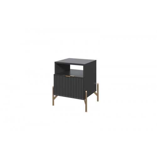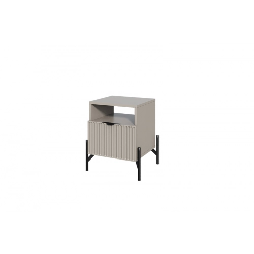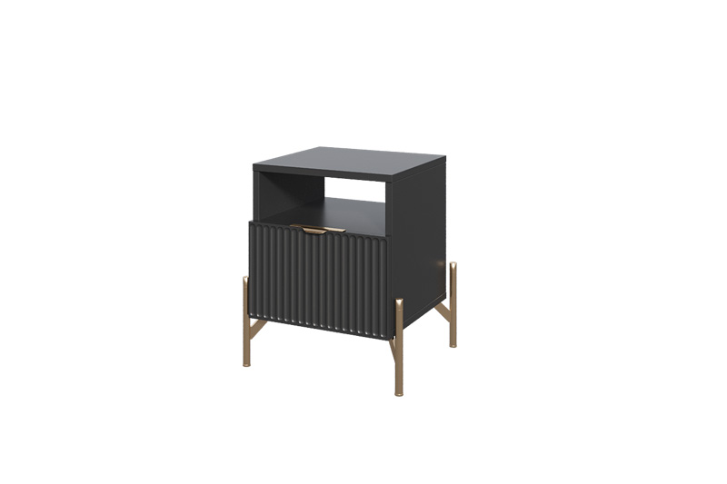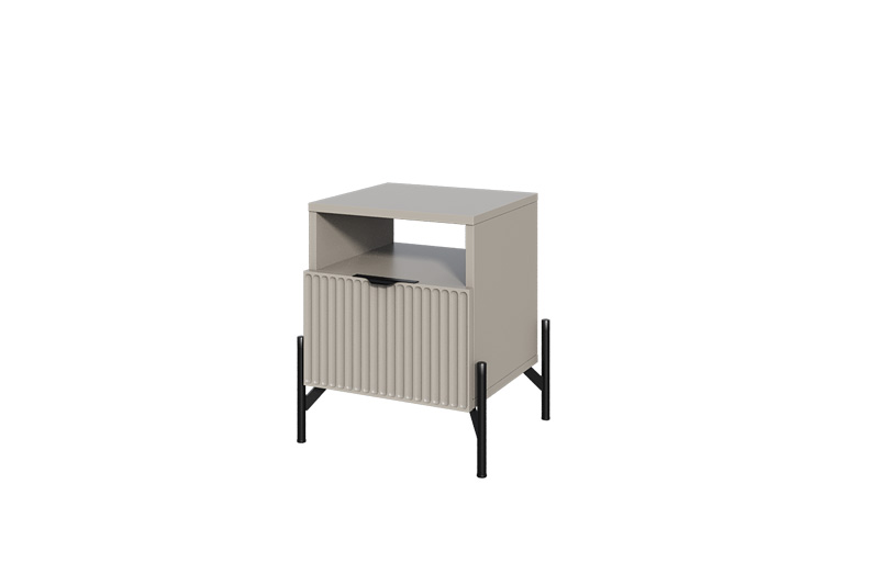 Прикроватная тумба «Нео» выполнена в современном минималистичном стиле с акцентом на строгую геометрию и выразительные детали. Декоративная рифлёная фасадная панель и изящные металлические опоры придают модели визуальную лёгкость и делают её актуальным элементом интерьера.